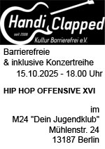 | 15.10.2025 - 18.00 Uhr rockradio.de-on concert HIP HOP OFFENSIVE XVI Live aus dem M24 -Dein Jugendklub-,Mühlenstr. 24, 13187 Berlin NUR VIDEO-Übertragung